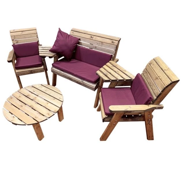Charles Taylor 4 Seater Multi Set Round: The versatile Charles Taylor 4 Seater Multi Set with Round Table is an ideal bench for people who seek a get-together garden experience and are attracted to the natural beauty of wood. The bench boasts an interesting design of a bench and an armchair that share a middle tray table, all in one piece. By detaching the tray tables you will have a regular set with separate seats. The 4 Seater Multi Set is made of Scandinavian Redwood which is a beautiful and durable wood resistant to decay and disease. It is fully treated for your peace of mind. The generously sized and sturdy seats come with a set of cushions in any one of three attractive colours. The side tray tables are very handy for holding your drink, while the round coffee table can accommodate everything from books and magazines to a cheese plater or shared finger food. Invite your best friends or your whole family to sit with you and stargaze together or talk about life, or just have fun amid your lovely garden. No matter the moment, the Charles Taylor 4 Seater Multi Set with Round Table is sure to enhance your outdoor space with its ingenious design and its rustic charm of natural wood.