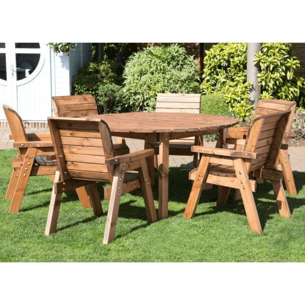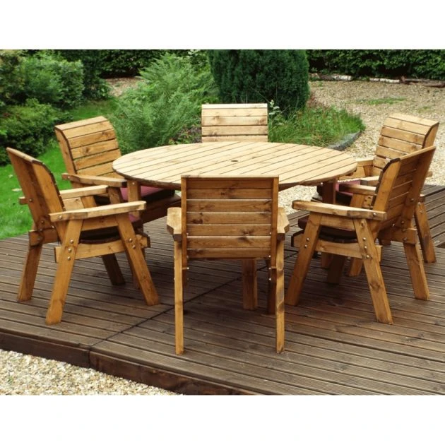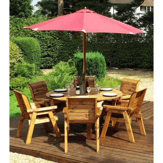 Charles Taylor 6 Seater Round Table Set: The Charles Taylor 6 Seater Round Table Set is an ideal dining set for a family keen on dining alfresco. The 6 Seater Round Table Set is made of Scandinavian Redwood which is a beautiful and durable wood resistant to decay and disease. It is fully treated for your peace of mind. The generously sized and sturdy seats come with a set of cushions in any one of three attractive colours. The set also includes a parasol with its base and a storage bag for the cushions. Gather your loved ones and share a pitcher of margaritas, finger food, dinner, or Sunday roast amid your lovely garden. No matter the moment, the Charles Taylor 6 Seater Round Table Set is sure to enhance your outdoor space with its traditional design and its rustic charm of natural wood.