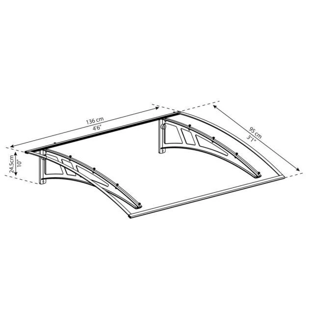 Palram-Canopia Canopy Calisto 1350 Grey Twinwall: Thsi awning is a gorgeous solution for covering single and double doors, windows or for smaller sheltered areas. It boasts a superb, attractive, curved design with a very strong and durable, high-impact, polymer support arms and anodized front and backaluminium trims for a high-end appearance and weather resistance. Also includes a superb strength Twinwall polycarbonate panel which is designed to provide excellent protection from snow, rain, hail, leaves and sun damage. Easy to install, durable and practical, the Aquila Canopy is, furthermore, a beautiful object that will provide your home with a touch of elegance.