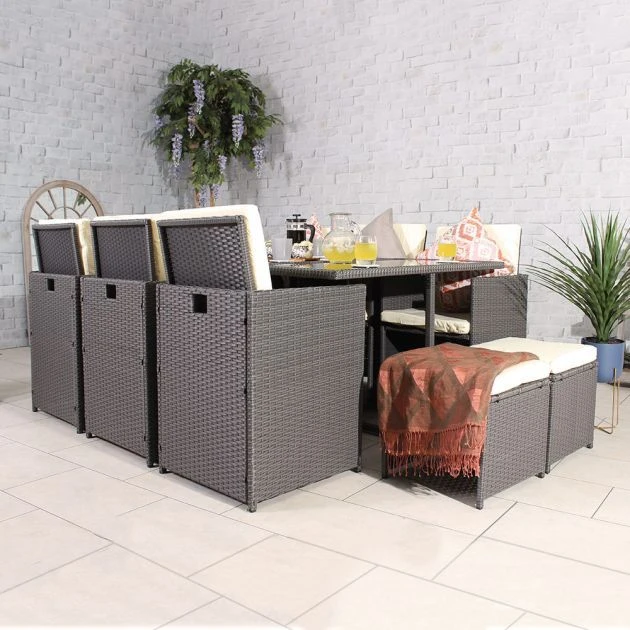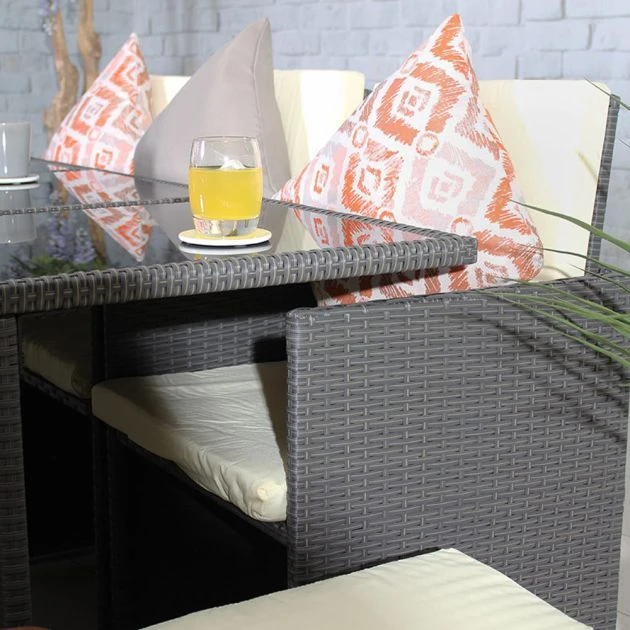 Royalcraft Cannes 10 Seater Cube Set:The Cannes Cube Set by Royalcraft would make the perfect addition to any garden, ideal for socialising with friends and family in the summer time. The Royalcraft 10 Seater Set is constructed with an attractive mocha brown rope effect, polyethylene flat wicker weave and an strong e coated steel framing for added strength. The Cannes Cube Set consists of 6 armchairs with folding backrests and four stools which can be easily stored under the table for a compact design and all with seat and back cushions for added support and comfort. The set also includes a large rectangular table with floating tempered glass table top for a lovely finish.