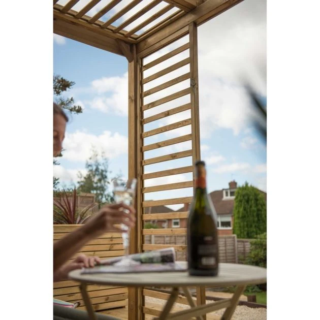 Forest Garden Dining Pergola: This stunning contemporary Forest Garden Dining Pergola provides definition and structure to an outdoor dining or entertainment area. This pergola would make an eye-catching feature in any garden, with panels that could be potentially used for climbing plants. The Forest Garden Dining Pergola is constructed from pressure treated Quality Approved timber giving this pergola the manufacturer’s guarantee against rot for 15 years.