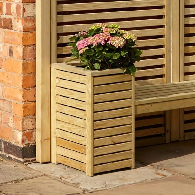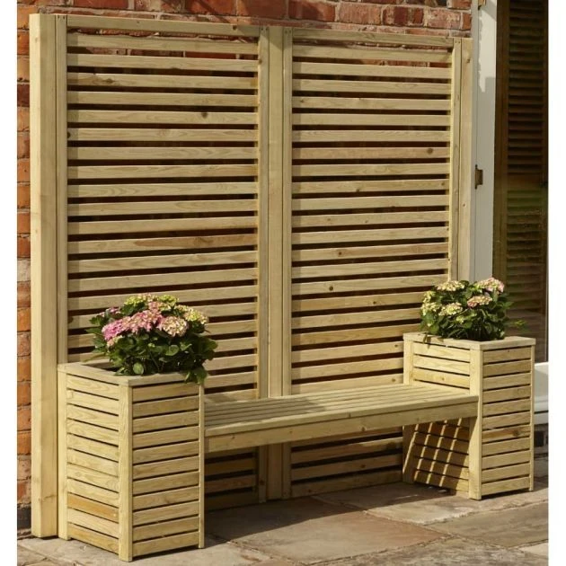 Garden Creations Seat Set. This stylish wooden slatted seat set will add a touch of class to your patio and comprises two back panels, two planters complete with planter liners and an integrated slatted seat bench. Complete with three posts, this set is made from Quality Approved timber and is pressure treated to protect against rot. The horizontal back panels can be placed against a wall and used as a back rest. The two planters fit neatly at either side of the bench seat so that you can enjoy your favourite plants whilst relaxing in the summer sun. Easy to assemble, this seat set includes a 5 year manufacturer’s warranty against rot.