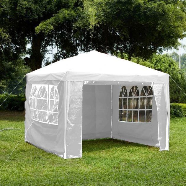 This gazebo is ideal for parties, weddings and other outdoor events. This gazebo features a wind bar, steel frame legs which can be erected on hard or soft ground and has four side walls (2 walls with windows and 2 walls with a zipper). The gazebo is made from a waterproof polyethylene fabric, which means that the gazebo is showerproof but it is not recommended as protection against heavy rainfall.