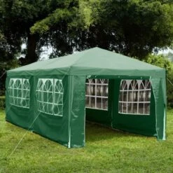 This gazebo is ideal for parties, weddings and other outdoor events. This gazebo features a wind bar, steel frame legs which can be erected on hard or soft ground and has four side walls (2 walls with windows and 2 walls with a zipper). The gazebo is made from a waterproof polyethylene fabric, which means that the gazebo is showerproof but it is not recommended as protection against heavy rainfall.