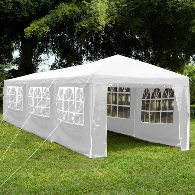 This gazebo is ideal for parties, weddings and other outdoor events. This gazebo features a wind bar, steel frame legs which can be erected on hard or soft ground and has four side walls (2 walls with windows and 2 walls with a zipper). The gazebo is made from a waterproof polyethylene fabric, which means that the gazebo is showerproof but it is not recommended as protection against heavy rainfall.