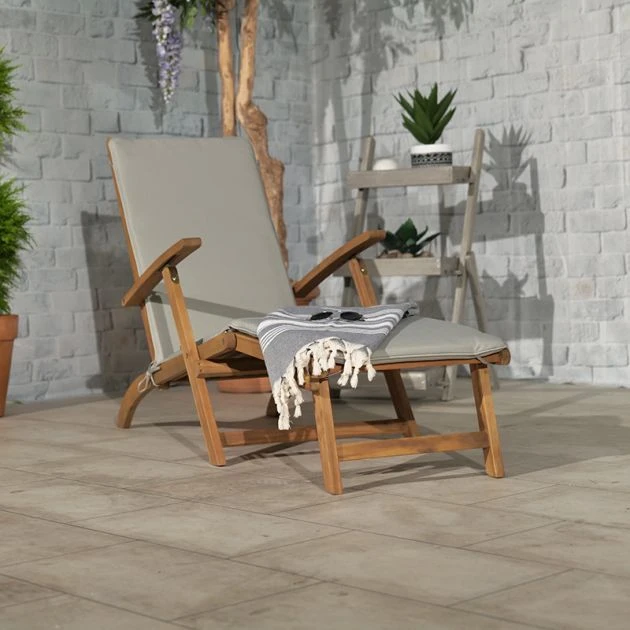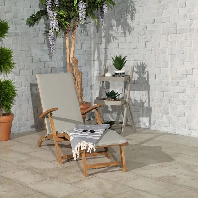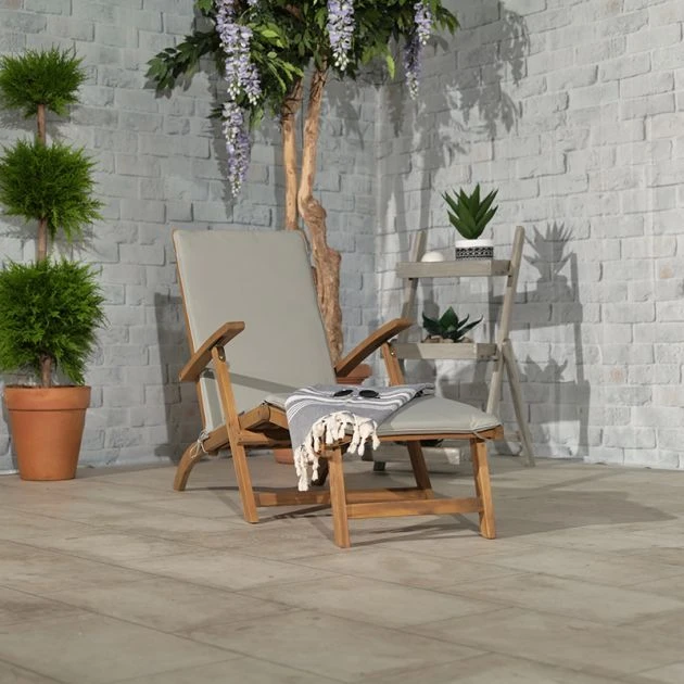 Royalcraft Henley Steamer Armchair with Grey Cushion:This Compact, high quality and contemporary Henley Steamer Armchair with Grey Cushion from Royalcraft offers an excellent and refreshing look and ensures luxury, elegance, and togetherness. It is an attractive feature for any small garden or patio. The chair is crafted from Eucalyptus Hardwood and painted in natural color. The armchair creates high-quality furniture with its warm tones and natural beauty.