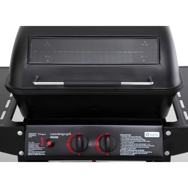 The Irvine Lava Stone Gas BBQ Grill features lava rocks heated by a gas flame. Lava rocks absorbs heat from your grill and spreads it evenly throughout the whole appliance, which means your food cooks more evenly and gently guaranteeing tender and juicy barbecued meats. The porous lava rocks also absorb grease and liquids. Easily create new and interesting dishes to delight your guests. In addition to its lava rock technology, the Irvine Grill has all the characteristics of a typical gas grill. Simply to light the gas, with the benefit of battery free piezo ignition, the grill heats up quickly and the heat level can be easily regulated. You can grill for a large number of guests with no interruptions.  The double burners can be adjusted separately for optimum temperature control. You can employ both direct and indirect grilling techniques to prepare any type of food just how you wish. Indirect grilling is where the food lies in an enclosed space and is the barbecue method of choice for gourmets. The two-tier design allows you to enclose the grill surface to prevent heat from escaping. The lid gives off focused heat, similar to a convection oven, allowing your food to cook evenly on all sides. The built-in viewing window allows you to check your food’s cooking progress without opening the grill and losing heat. A small removable grease pan collects excess juices and grease for easy disposal. Once you have finished cooking, turn the BBQ on a high flame and leave it to burn for 5 minutes with the lid open. This will allow residues to be burned away, making cleaning easier. Mounted on a trolley with two wheels, the Irvine Grill can be manoeuvred with ease. The working height is approximately 84.5cm. A large shelf under the grill provides useful storage together with two side shelves, which can be removed for storage. A black textile front screen keeps everything looking neat and tidy.