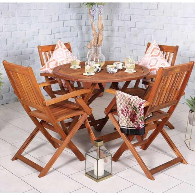 Royalcraft Manhattan Round Dining Set with Folding Armchairs 4 Seater:This Compact, high quality and contemporary Manhattan Round Dining Set with Folding Armchairs from Royalcraft offers an excellent and refreshing look and ensures luxury, elegance, and togetherness. It is an attractive four-seater small dining set, perfect for a smaller garden or patio. The set is crafted from Plantation Acacia hardwood and painted in natural color, which makes the set more attractive and long-lasting. The four-seater set consists of four folding armchairs and a 90cm diameter round wooden top table, perfect for use as outdoor dining. The set creates high-quality furniture with its warm tones and natural beauty.