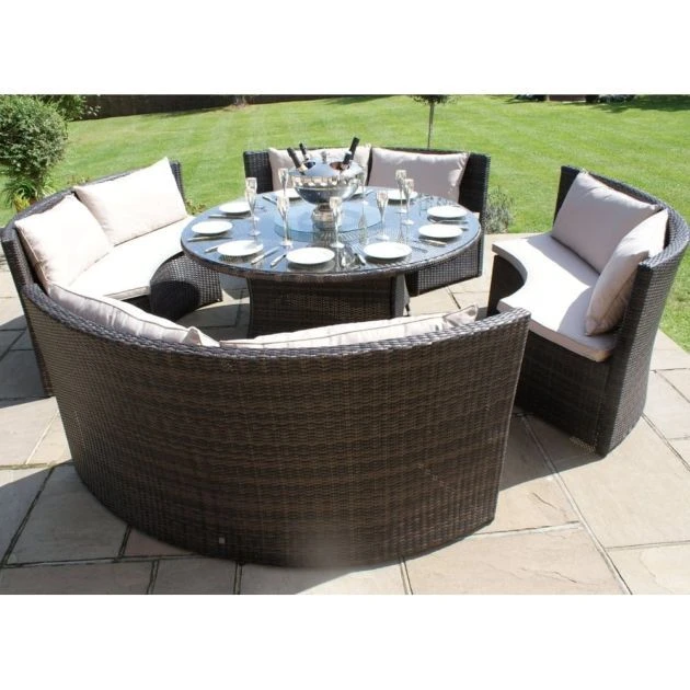 Maze Rattan Dallas Sofa Set: This 8 Person round dining sofa set consists of a large 160cm round table with tempered safety glass and 4 benches which seat 2 people on each and include seat and back cushions. If you are looking for something more unique than a standard round dining set then this Maze Rattan Dallas sofa set is for you. It will be the talking point of friends and family with its stylish and contemporary appearance making it stand out from the rest. This sofa set benefits from a durable aluminium framework that will not rust over time and strong rattan flat weave which can be left outside in all weathers and requires little to no maintenance year after year. This set has been designed with longevity in mind and comes with a 1 Year manufacturer’s guarantee for absolute peace of mind. This set will be delivered to you flat packed for easy self-assembly.