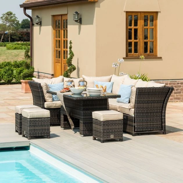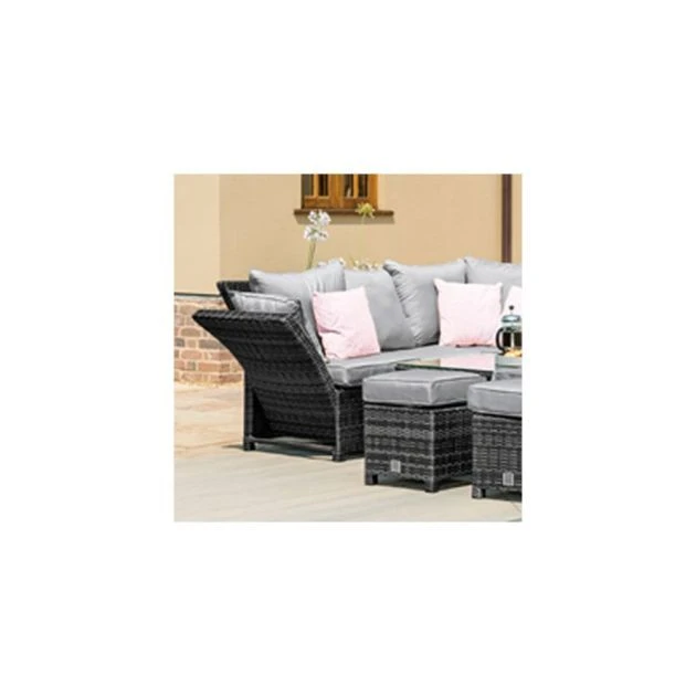 Maze Rattan Henley Corner Dining Set with Rising Table: The Henley Corner Dining Set by Maze Rattan has been created with style and comfort in mind as this set combines both dining and sofa features to create the perfect outdoor garden set. The Maze Rattan Set features adjustable armrests with a reclining mechanism to allow you to put your feet up and lounge around and also includes deep filled back and base padded cushions for added support and comfort. The Henley Corner Set also includes a rising table to transform your lounge set to an ideal place for al fresco dining in the summertime. The Maze Rattan Corner Set is made with flat weave hand woven rattan and a powder coated aluminium framing for a low maintenance design.