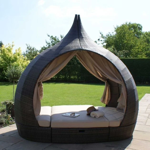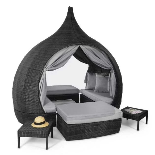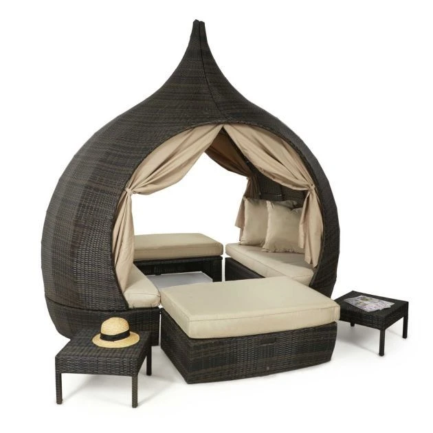 Maze Rattan Peach Daybed: The Peach Daybed by Maze Rattan is a stylish and high quality piece of furniture that would make a wonderful addition to your garden. The Maze Rattan Daybed can be used in multiple designs by pulling the sections out to create a socialising seating space or by relaxing on the whole of the full daybed. The Peach Daybed consists of cushioned sofa seats with four additional scatter cushions, drape curtains for extra privacy and two side coffee tables perfect for drinks. The Maze Rattan Daybed is made with high quality synthetic flat rattan weave in a choice of grey or brown, handwoven onto a sturdy aluminium frame for a rust free design.