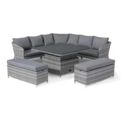The Santorini Deluxe Corner Dining Set with Rising Table is the epitome of luxury and style. This stunning outdoor furniture set features a deluxe corner sofa and matching benches, all upholstered in an elegant mixed grey weave that is sure to impress. The deep-filled cushions provide maximum comfort, making it the perfect place to relax and unwind in your outdoor space. The rising table is a particularly impressive feature, allowing you to effortlessly switch between dining and lounging. With a simple adjustment, the table transforms from a dining table to a coffee table, adding an extra level of versatility to this already magnificent set. Whether you’re entertaining guests or simply enjoying an afternoon in the sun, the Santorini Deluxe Corner Dining Set with Rising Table is the perfect choice.