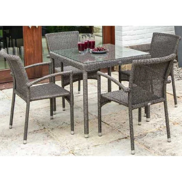 Alexander Rose Monte Carlo Square Dining Set for 4: if you are attracted to a combination of aesthetics and practicality you won’t be able to resist the Monte Carlo range of outdoor furniture by Alexander Rose. Designed with great care and intricately woven in 3mm dark grey rattan, the Monte Carlo Square Dining Set for 4 showcases gorgeous lines and attention to detail. The sturdy table comes with a tempered glass top which is easy to clean but difficult to break, and the armchairs are stackable for easy storing. The internal aluminium frame means that the set is fairly lightweight and that it won’t rust. An outdoor dining set like this speaks of refinement, luxury and comfort, and there is no way that it won’t become a favourite among garden enthusiasts and people who appreciate beauty.