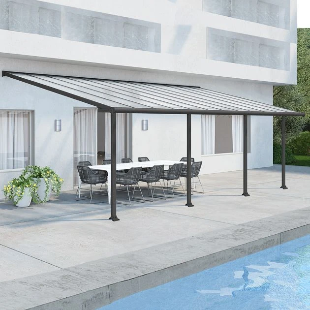 Palram-Canopia Olympia 3m x 7.3m Patio Cover – Grey: This premium quality patio cover from the Palram-Canopia range has a generous roof panel thickness of 16mm compared to the standard 8mm thickness found on other models. It also features 8cm x 8cm square upright poles as opposed to the 8cm x 4cm poles found on other models. This patio cover attaches to the exterior wall of the house allowing you to extend the garden season by providing you with a protected area to sit and relax even when the weather isn’t going in your favour. The height on the Olympia patio cover is adjustable so that you can choose the pitch of the roof and fit the cover above existing doors and windows on the house. Add a touch of elegance to your outdoor area by installing the inviting and sleek-looking Olympia patio cover.