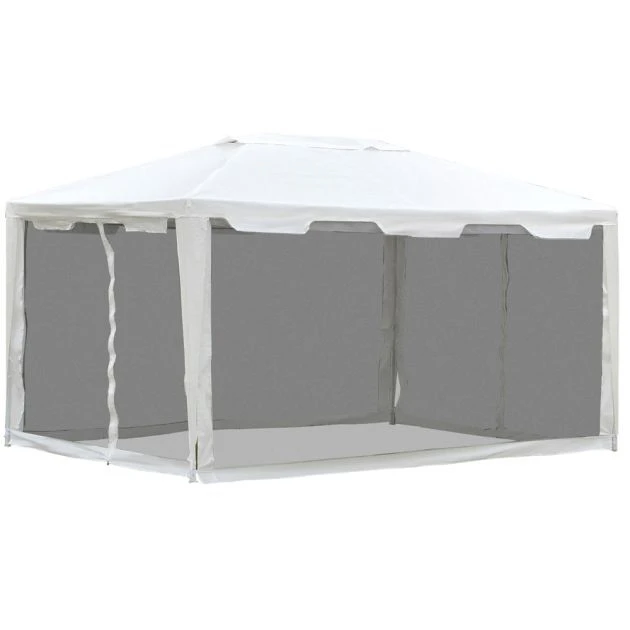 Outdoor Garden Party Marquee Tent with Mesh Sidewalls White 3 x 4m:Â Grab your favorite drink and enjoy the shade of freedom with this marquee gazebo with sides. The sturdy frame adds a durable place for you to relax in the shade. This party gazebo is perfect for any occasion such as family gatherings, picnics, camping or tailgates. Powder-coated steel frame covered with a UV resistant and water-resistant PE cloth for shelter. The mesh sidewalls make it great for keeping bugs out, so you can enjoy the outdoors even if the sun goes down.