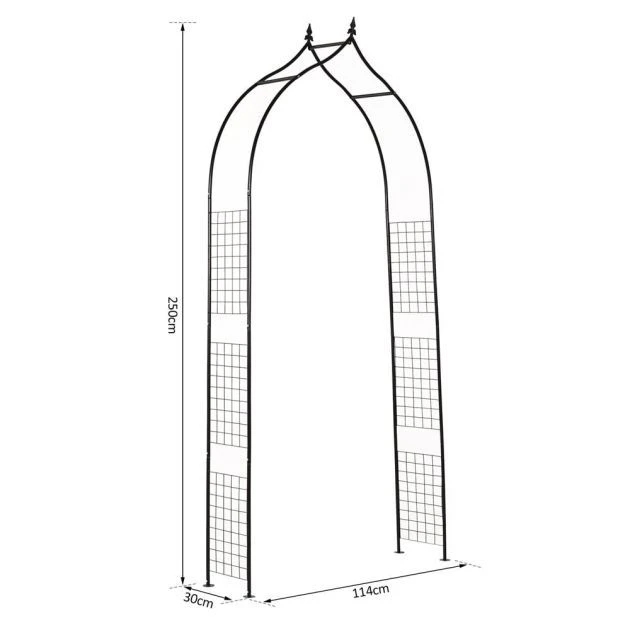 Create that elegant spot in your garden that you’ve always dreamt of with this garden arch from Outsunny. A tall 250cm x 114cm in size, it is made into a smoothly curved pellet shape, where three sets of trellis grids are placed on both sides for climbing plants and vines to wrap themselves around with full support. Peaked on the top, there are two rails for hanging flower baskets from to interject even more colour and vibrancy. The frame, made from metal, is finished with a matte black powder coating, which provides extra support to ensure it is a mainstay in your garden for years to come. Perfect for use all-year round, or even as an occasional piece to bring life and vibrancy into your garden parties, weddings and more.