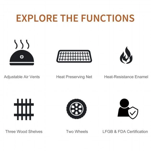 - Wood shelf on bottom for storing charcoal and utensils.