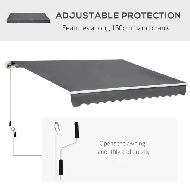 This awning from Outsunny will provide you with all the shade you need his season. The thick, sun shielding canopy is fixed on an aluminium frame, and the 4m x 2.5m offers a large shaded area out of the heat of the blazing sun. This awning features a manual design that allows you to set it up where you require, whether thats above a door or window, and mounts quickly by using the accessories included. Finished with a crank handle for easy operaton, sitting outdoors has never been more enjoyable or stress free.