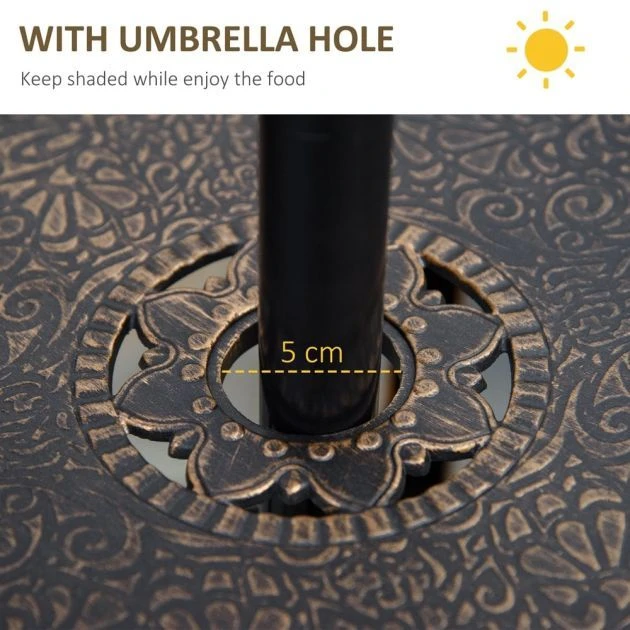 Start enjoying your time outside for longer with this 4 seater dining set from Outsunny. You can quickly create a great outdoor setting to spend time with your friends and family in. The antique design with bronze finish gives your patio a sense of luxury into the whole space. The table features a hole in the middle to allow for a parasol to be placed for when you are wanting to create an area of shade when dining. The furniture set is made from a cast aluminium frame which is finished in a bronze colour.