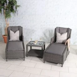 Royalcraft Paris Rattan High Back Recliner Comfort Set 2 Seater:The Paris 2 Seater High Back Recliner Comfort Set from Royalcraft is a luxurious lounge set which is ideal for any outdoor patio or decking space. This set is made with double round wicker handwoven onto a rust-resistant aluminium frame for a sturdy structure and weather shield fabric cushions made from high-grade fire retardant spun polyester. Ideal for drinks or dinner in the afternoon sun, this companion set consists of two gas-operated recliner chairs and two footstools with padded seat cushions for added extra comfort. The set also comes with a square tempered safety glass table which is perfect for use as a coffee table or side table. This set comes with premium weather shield fabric cushions.