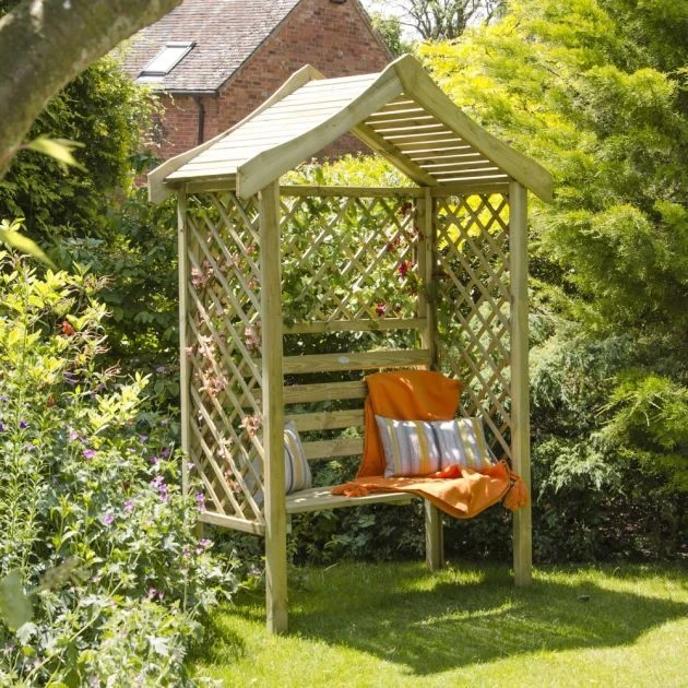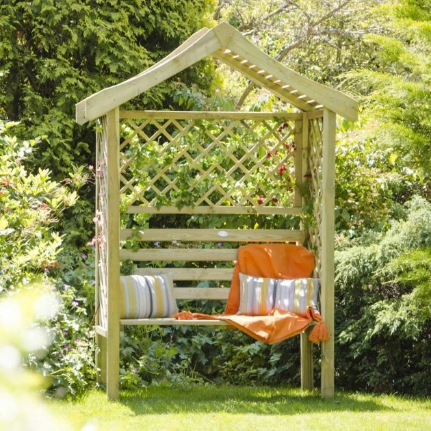 Forest Garden Parisienne Arbour: A very elegant arbour seat with a traditional bench, trellis sides and back and a solid stunning roof. Very easy to build. Creates a quiet area to sit and watch the world go by on warm summer days. The sides of the arbour are an attractive trellis and the roof features its distinctive facia trim.