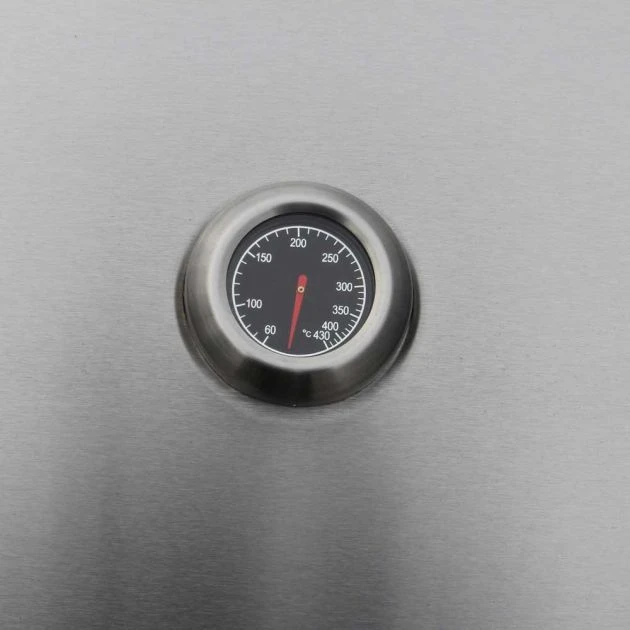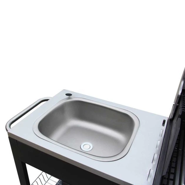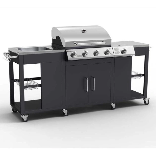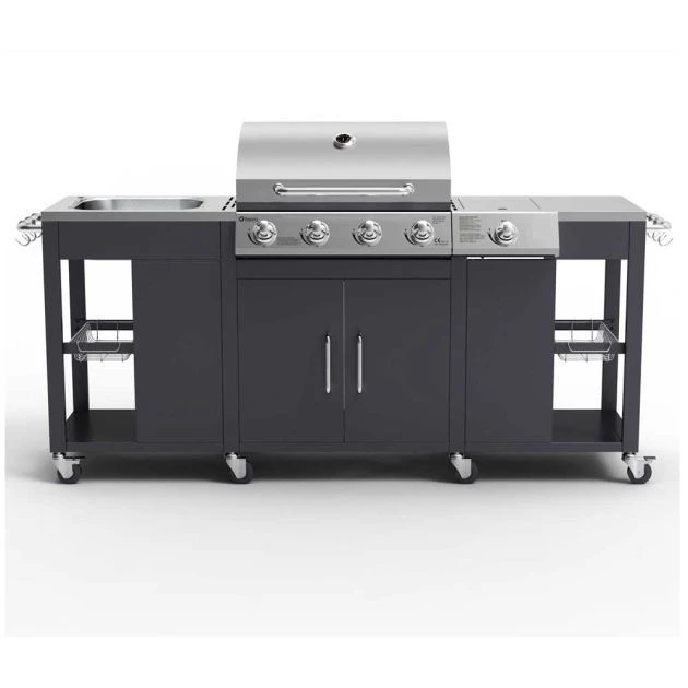 Petersburg Outdoor Kitchen: The Petersburg Kitchen is a stunning outdoor catering unit with a four burner gas BBQ, side burner, sink (does not include a tap), plentiful storage and a sleek stainless steel countertop mounted on eight swivel castors, four of which are lockable. The gas barbeque has four independently controllable 3.5kW stainless steel burners with push and turn piezo ignition. The large 63 x 46.5cm cooking area comprises an enamelled cast iron grill grate and a plancha style plate. A warming rack enables you to keep food warm, whilst you continue cooking. Aluminium coated flame tamers protect the burners, reducing flare ups and optimising heat distribution. The lid has a built-in thermometer enabling you to monitor the temperature in the cooking chamber. The side burner has a 3.2kW burner with a 61 x 16cm enamelled pot holder and lid. There is a cupboard with double doors, two side shelves, two chrome plated storage baskets and six utensil hooks. The Petersburg Kitchen has a powder coated framework, complimented by the sleek stainless steel worktop and grill. The working height is 90cm. Supplied with a gas hose and regulator.