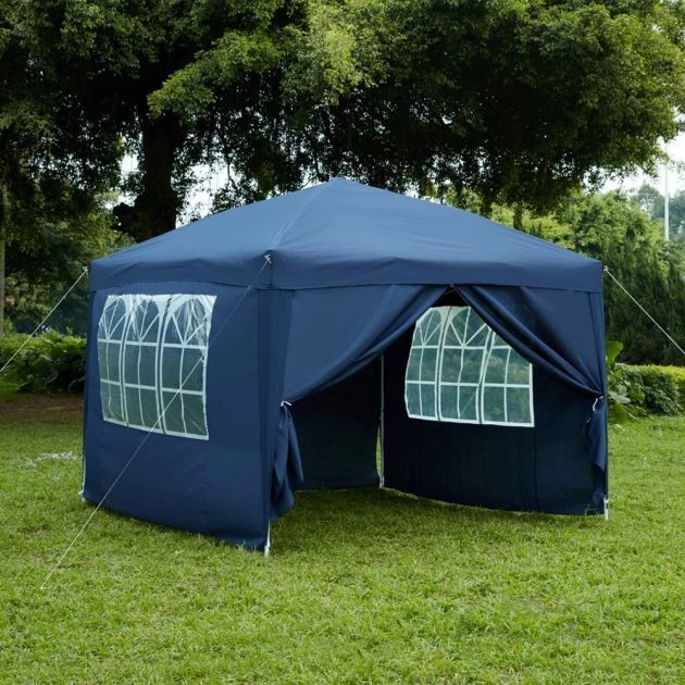 This gazebo is ideal for parties, weddings and other outdoor events. This gazebo features steel frame legs which can be erected on hard or soft ground and has four side walls (2 walls with windows, 1 wall with a zipper and 1 wall without a window). Furthermore, the gazebo comes with two wind bars, four sand bags and a carry bag for portability. The gazebo is made from a waterproof polyethylene fabric, which means that the gazebo is showerproof but it is not recommended as protection against heavy rainfall.