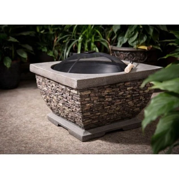 Callow Premium Wood Burning Stone Fire Pit: The beautiful intricate stone effect body of the Premium Square Fire Pit will compliment any type of garden or patio. The stylish design is ready made with no construction needed. Simply take it out the box, place it in your desired location in your garden or patio, and away you go. The wood burning fire bowl will withstand high temperatures and is painted black for protection against rust. A grate is included for placing wood on in the fire bowl. This Fire Pit comes complete with a poker and a spark guard.