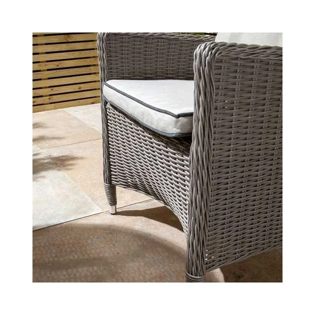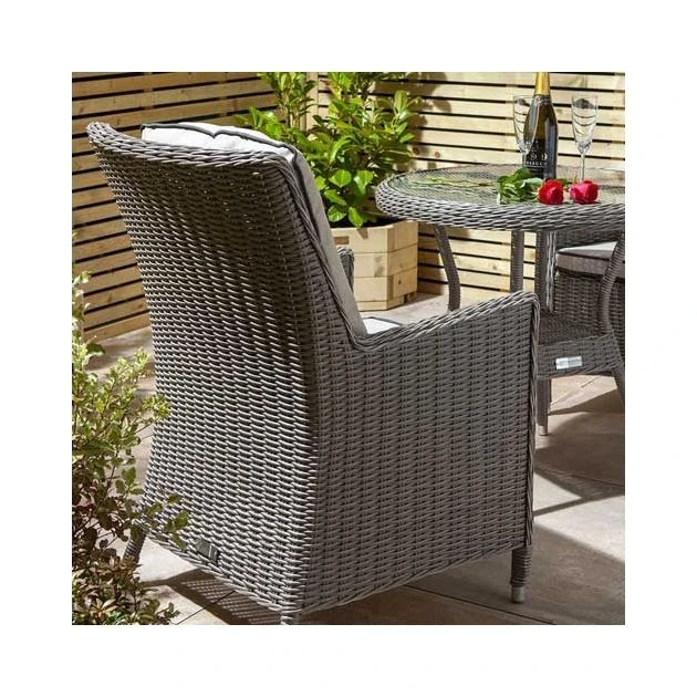 With a beautiful glass top table, this set is sure to impress in any garden. Seating up to 2 people, it is simple yet the grey beings out the elegance. The chairs are equipped with back rest cushions and seat pads, to ensure comfort throughout the long evenings you spend with loved ones out in the garden, especially in the summer. The weatherproof 6.5 half round wicker with full round detailing is sure to provide beauty and should grab the attention of your visitors when they come round to visit your home and garden.