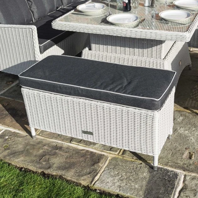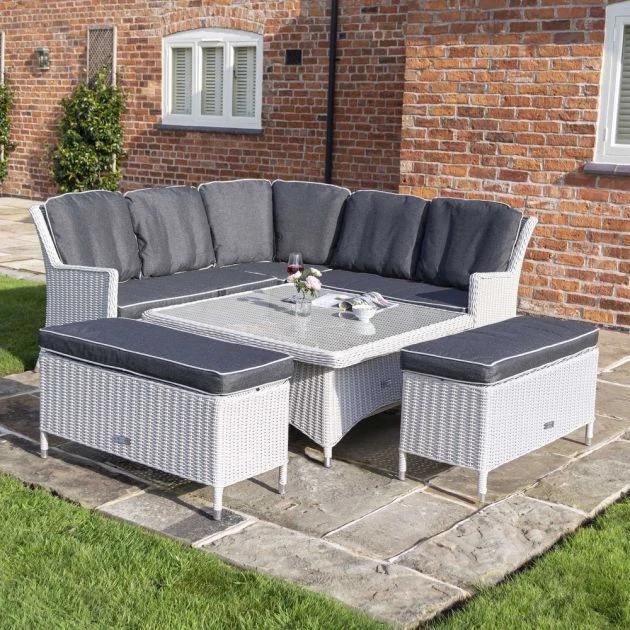 Prestbury Corner Dining Set: The Prestbury Range by Rowlinson is a contemporary collection of rattan 6.5 half round wicker furniture that will be an asset to every garden. The Set includes a generously sized corner sofa, 2x ottoman benches and a height adjustable table which can be used for dining, but also lowered to coffee table height for those relaxed social events. The set seats up to 9 people comfortably and features glass top tables, modern charcoal grey cushions with a stunning white piping for that extra pizazz.