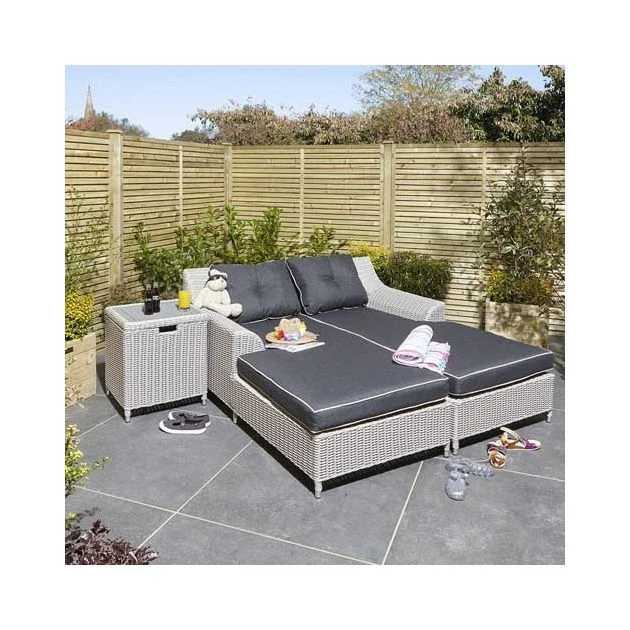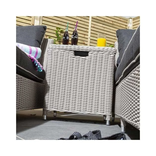 This handy sun lounger is perfect for any back garden with a loved one – it comes with one left and one right handed lounger beds, both accompanied with cushions and seat pads. Dependent on how you are feeling that day, this can be as singular beds or can be pushed together to create one day bed for you to just relax on. It has a dark grey powder coated aluminum table top with built in storage for an easy way to keep things dry when outdoors if an odd random shower passes by. The 6.5mm half round wicker that this is made with is weatherproof also, meaning if this is left outside for an extended period of time in wet weather, this will not be affected. The light putty grey coloured rattan is sure to impress across the summer months especially.