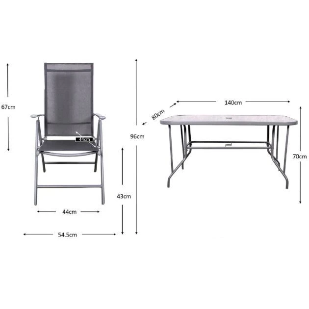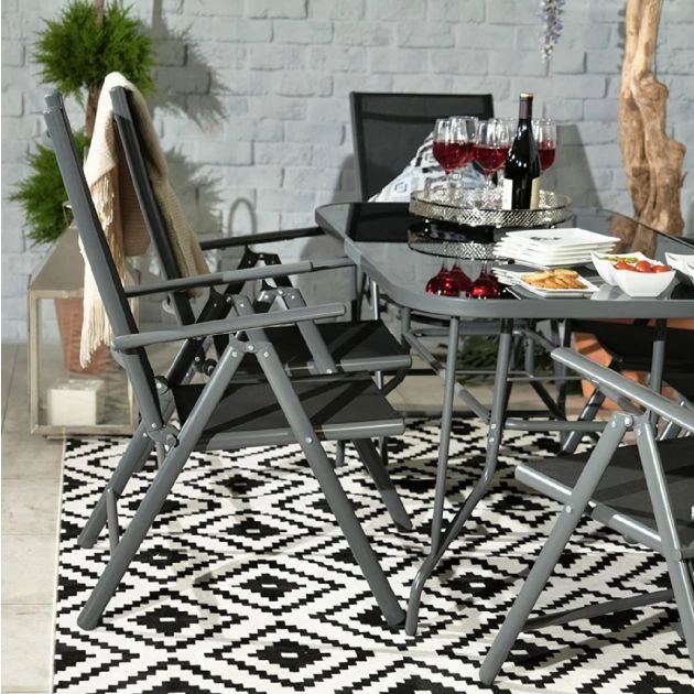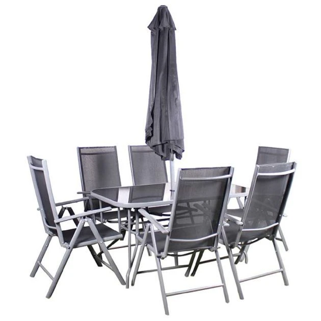 Rio Recliner Dining Set with Parasol 6 Seater: Modern and contemporary design The Rio Recliner Dining Set by Royalcraft is the ultimate dining set for any patio, garden or deck space. The set is made with high-quality powder-coated grey steel frames to prevent rust, which makes the set more attractive and long-lasting. The set consists of six recliner chairs with storage facilities and a black tempered glass-topped rectangular table. This set also comes with a standard parasol. The great style addition to this six-seater dining set is the ultimate set that allows you to fully unwind and relax.