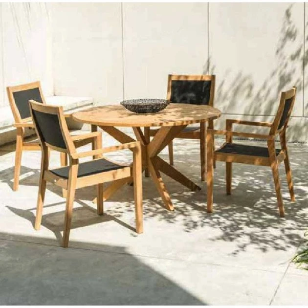 Alexander Rose Roble 1.25m Round Dining Set: Alexander Rose takes great pride in their flagship wood, roble, and this shows in every piece of furniture or set that features it. Roble is a durable and robust wood and has excellent working properties. It finishes appealingly in natural colour and it is extremely resistant to decay. It is a gorgeous wood that is responsibly harvested from Bolivia. The appealing Roble 1.25m Round Dining Set will be a great addition to your garden. Enjoy eating and drinking with your loved ones on a spring or summer day, finally taking full advantage of your garden. The Round table will allow you and your guests to look each other in the eye. You have a choice of chairs, both beautiful, top-quality and comfortable. Both Side Chairs and Stacking Armchairs feature spacious seats and slightly curved backs whereas the stacking armchairs come with durable slings in contrasting charcoal grey colour. The Alexander Rose Roble 1.25m Round Dining Set will become your family’s favourite eating spot and a focal point in your outdoor area.
