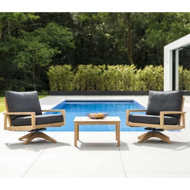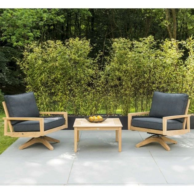 Alexander Rose Roble Swivel Lounge Set: Alexander Rose takes great pride in their flagship wood, roble, and this shows in every piece of furniture that features it. Roble is a durable and robust wood and has excellent working properties. It finishes appealingly in its natural colour and it is extremely resistant to decay. It is a gorgeous wood that is responsibly harvested from Bolivia. If you want to update your outdoor space why not do it by adding a grand “twist”? And if you are attracted to a combination of aesthetics and practicality you won’t be able to resist the Roble Swivel Lounge Set. Designed with great care and beautifully crafted in a roble frame, the set showcases gorgeous lines and attention to detail. Make tea or coffee-time a great indulgence to be enjoyed amidst your garden and take advantage of the swivelling chairs – an outstanding feature unto itself. The chairs’ backs are fixed in a reclined position so you can experience even further comfort no matter how long you spend sitting down. The comfortable cushions’ covers are made from Olefin fabric. Olefin is a lightweight outdoor fabric with a low moisture intake and resistant to fire, abrasion, wrinkles and stains. Indulge yourself and purchase the Alexander Rose Roble Swivel Lounge Set to relax amidst your garden in ultimate comfort and style. The set is also ideal for smaller outdoor spaces like patios.