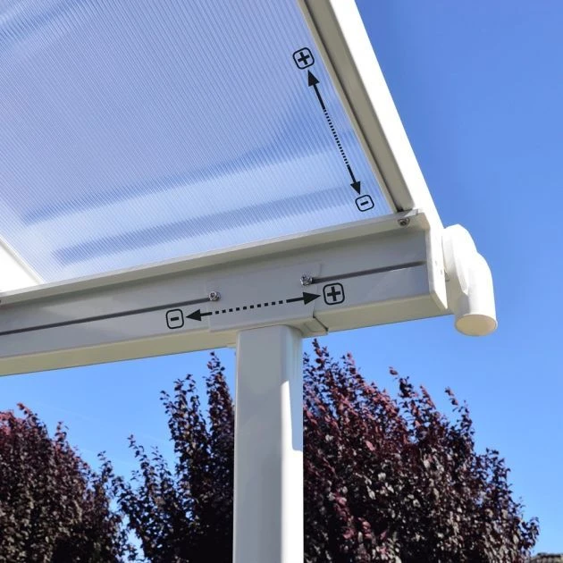 Palram-Canopia Sierra 3m Width White Patio Cover: This attractive and contemporary Palram-Canopia Sierra patio cover is available in white with a sizing of 3m x 3.05m. The patio cover can be purchased in multiples to create a longer patio cover depending on your size requirements. When purchasing multiples you will receive the joining kit to attach the patio covers together to create one seamless structure. This patio cover is adjustable in height so that you can fit it to your external wall with ease and the package includes an anchoring kit to fix it securely to the ground. The Sierra patio cover features rust resistant powder coated aluminium profiles and a 4mm polycarbonate panelled roof which is UV protected for a long lasting quality finish that will require very little maintenance. There is a 7 year manufacturer’s warranty included with this patio cover as standard for absolute peace of mind