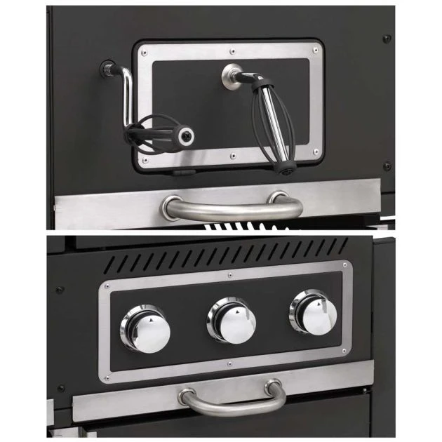 Toronto Combi Charcoal Gas BBQ: The Toronto Combi Charcoal Gas Barbecue combines the best of both worlds, charcoal and gas. The left hand side is a traditional charcoal barbecue, whilst on the right hand side is a three burner gas barbeque. Both cooking chambers have Chrome Plated Steel, approximately 41.3 x 41.3cm with enamelled warming racks. The charcoal fuel tray will hold a maximum 1.5kg charcoal, which can easily be topped up by opening the door to the charcoal fuel tray, minimising heat loss. The fuel tray can be height adjusted using a crank mechanism. This can be used to control temperature, by increasing the distance from the food, the heat will be less intense. In addition, there is an adjustable air vent, which can be used to alter the airflow and therefore, temperature of the coals. The gas BBQ has three 2.9kW stainless steel burners with push and turn ignition and flame tamers. The flame tamers protect the burner, reducing flareups and optimising heat distribution. The burners can be individually adjusted. Both barbecues can be used for direct or indirect cooking. The lids both have thermometers enabling you to monitor the temperature in each cooking chamber. The stunning Combi Barbeque is mounted on a trolley with four swivel casters, two of which are lockable. The trolley has a cabinet fitted with a gas bottle holder on one side, a shelf, drawer and two side shelves providing ample storage. In addition, this barbecue comes with four useful tool hooks, a handy bottle opener and is supplied with a gas hose and pressure regulator.