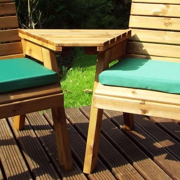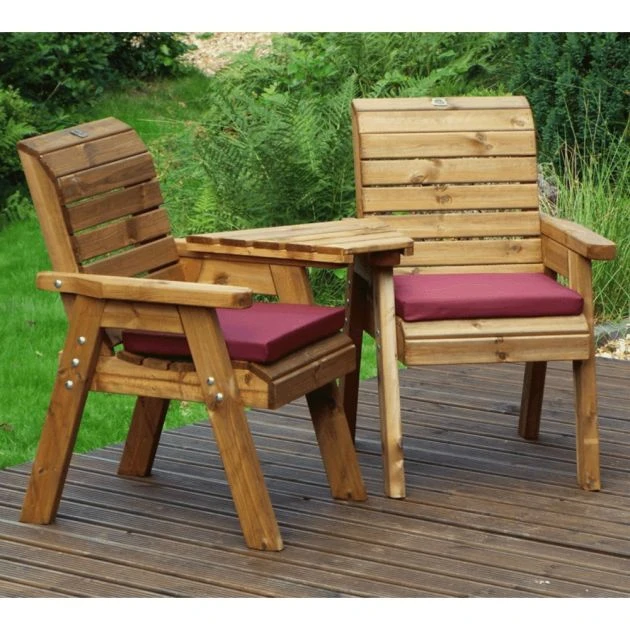 Charles Taylor Twin Companion Set Angled: The Charles Taylor Angled Twin Companion Set is an ideal bench for people who seek a calming garden experience and are attracted to the natural beauty of wood. The bench boasts an interesting design of two armchairs and a shared middle table, all in one piece. Solitude is good, company’s even better and three’s a crowd! The Twin Companion Set is made of Scandinavian Redwood which is a beautiful and durable wood resistant to decay and disease. It is fully treated for your peace of mind. The bench’s generously sized and sturdy seats come with an optional set of cushions in any one of three attractive colours. The table is very handy as you can rest several things there like your glasses, your drink, a snack, or a book. Invite your loved one to sit with you and stargaze together or talk about life amid your lovely garden. No matter the moment, the Charles Taylor Twin Companion Set is sure to enhance your outdoor space with its ingenious design and its rustic charm of natural wood.