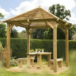 Forest Garden Venetian Pavilion with Deck: The Venetian Pavilion by Forest Garden is a wonderful outdoor structure to add style to your garden. This Pavillion INCLUDES the decking floor for a fully timber overall finish. The Forest Garden Pavilion features a beautiful Venetian style roof to shelter you from any passing showers whilst also allowing natural light to shine into the structure. The Venetian Pavilion is made with pressure treated Quality Approved timber to ensure full protection against rot and weather elements and comes with a 15 year anti rot warranty.