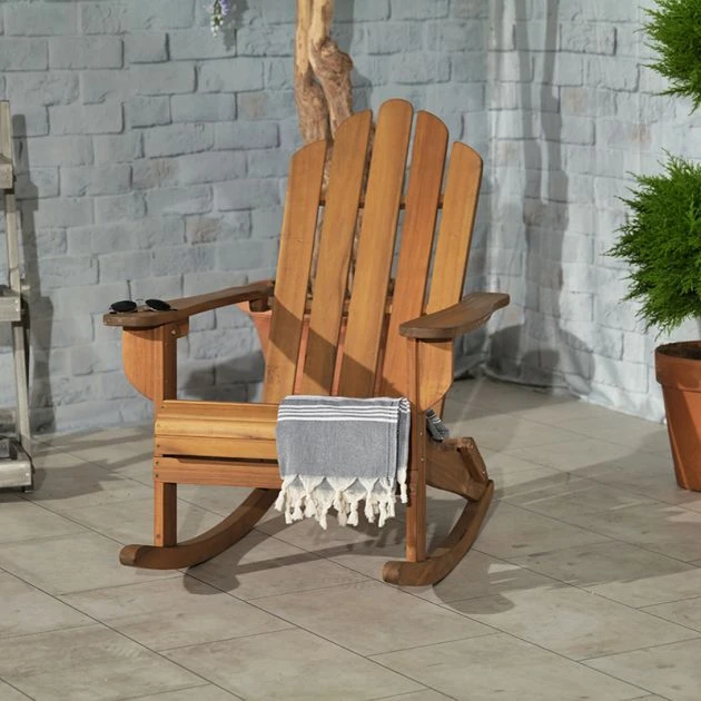 Royalcraft Vermont Rocking Adirondack Armchair: This Compact, high quality and contemporary Rocking Adirondack Armchair from Royalcraft offers an excellent and refreshing look and ensures luxury, elegance, and togetherness. It is an attractive feature for any small garden or patio. The chair is crafted from Plantation Acacia hardwood and painted in natural color. This set on curving supports so that the sitter may rock backwards and forwards. The rocking armchair creates high-quality furniture with its warm tones and natural beauty.