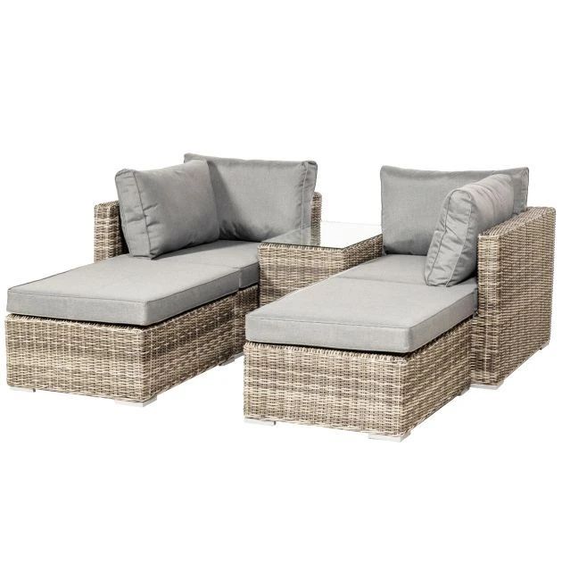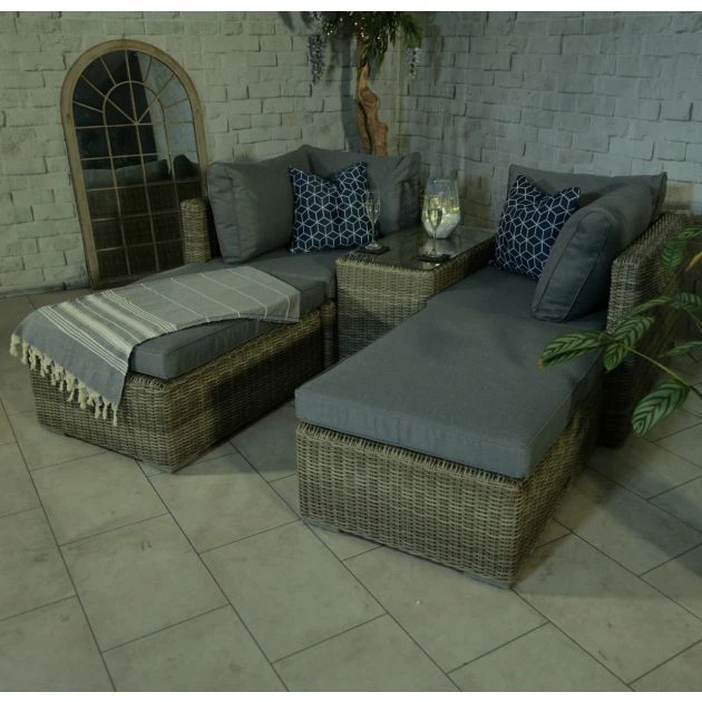 Royalcraft Wentworth Multi Relaxer Sun Lounger Set 4 Seater is ideal for lounging and relaxing in your gardens in the summertime. The set is modern and sleek in design. The set comes with an attractive mixed two tone natural synthetic rattan with a lightweight aluminium framework. The sun lounger benefits from a manual multi-position which is adjustable in position for maximum comfort whilst sunbathing in the garden. The set also comes with a small side table that includes with tempered glass top. It offers flexible sitting positions. Seats include grey weather-shield full length padded cushions.