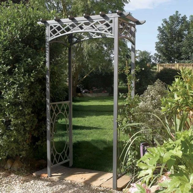 Wrenbury Metal Arch: Featuring a metallic grey powder coated finish making this arch a sturdy and contemporary steel garden arch for the garden.